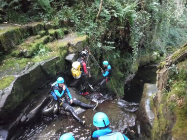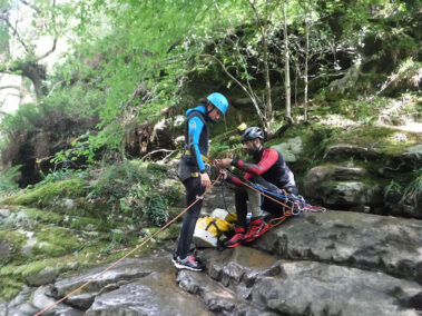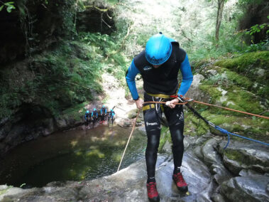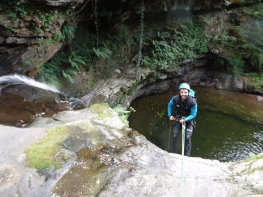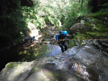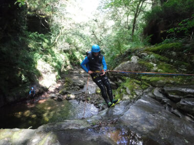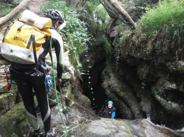 Comenzamos la actividad con una primera parte con dos rápeles o saltos opcionales de 8 y 10 metros respectivamente para entrar en una zona cerrada o engorgada del barranco con un pequeño tobogán y un rapel de 5 metros.